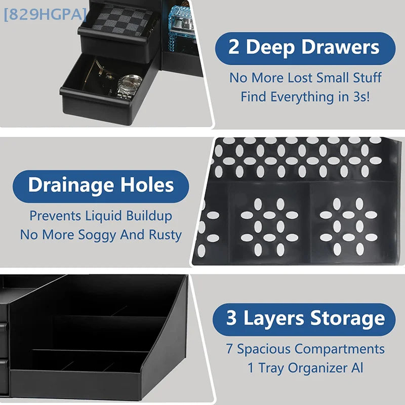 2,LARGE CAPACITY & ZERO CLUTTER: Featuring 7 spacious compartments and 2 extra-deep drawers — find everything in 3s. Suitable for men's-room counter top, night stand organizer and accessories.
