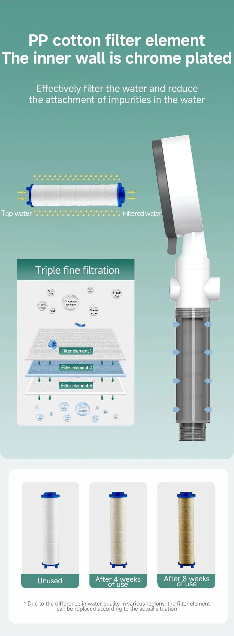 3. Use different modes to rinse the head, and the shower with filter can keep the passing water clean
