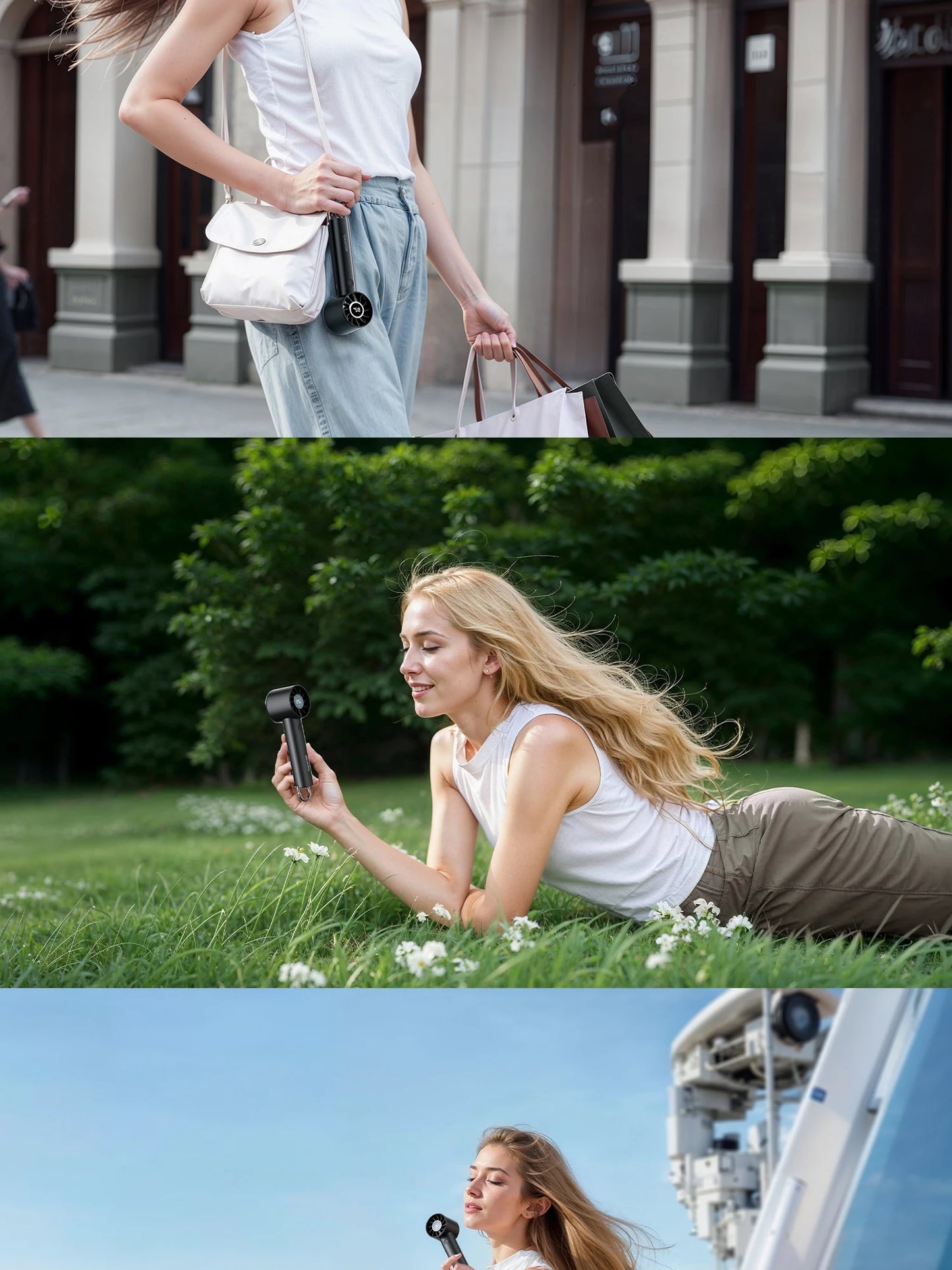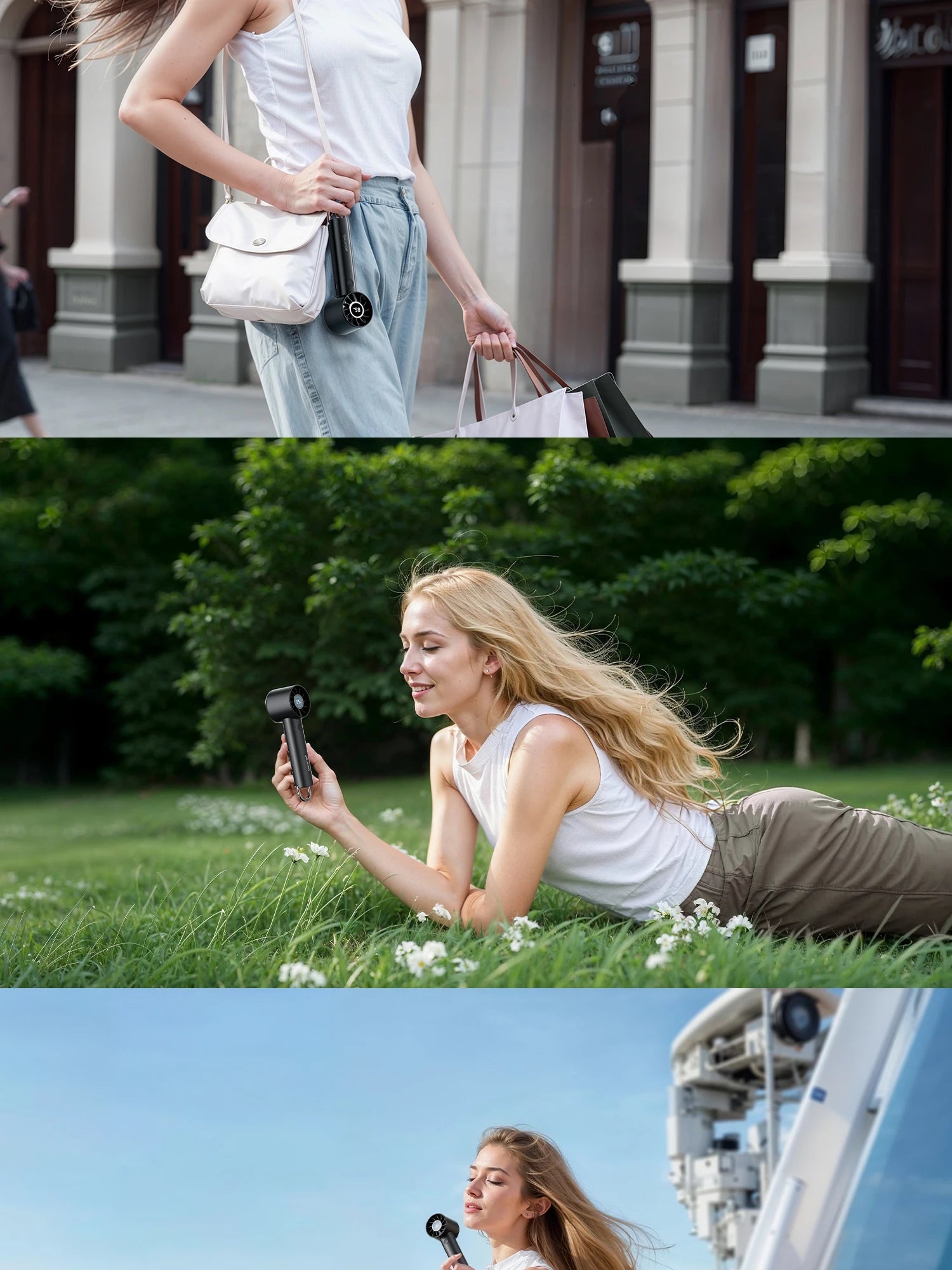 【3-Speed & Powerful Wind】This portable mini fan has a built-in powerful brushless motor, which is powerful enough to stably drive the fan blades to rotate at high speed to generate strong wind. The hand held fan has 3 adjustable wind speeds. Just press the power button to change the wind speed settings. Press the low speed 1600r/m, the medium speed 2300r/m, and the high speed 2900r/m. The wind is powerful enough to cool you down quickly.