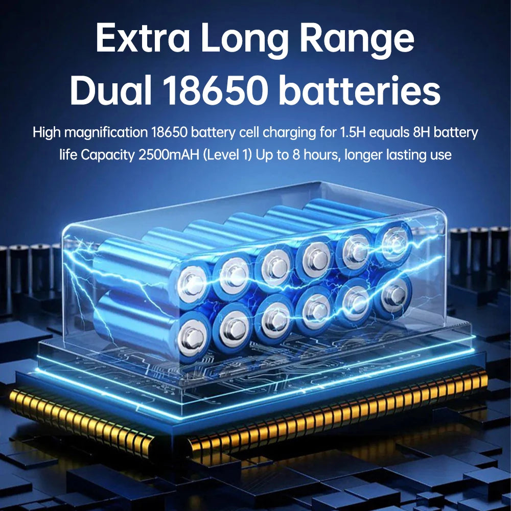 3. With charging protection and overheating protection, built-in two high rate dual 18650 battery cells, battery capacity of 2500mAh, full in just 1.5 hours, a gear up to 8 hours of super endurance, the use of more durable! Give you a different experience.